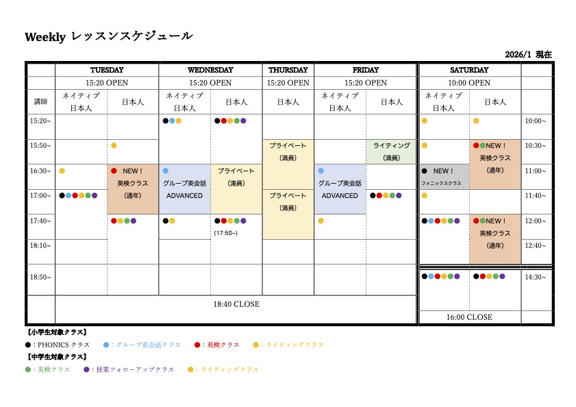 1週間のレッスンスケジュールはこんな感じです。(2026年1月)